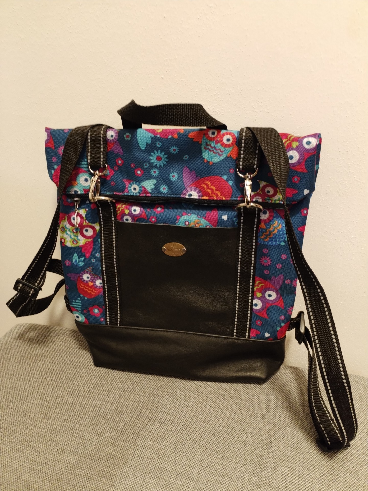 - Barva: Tmavě modrá s barevnými detaily, černá kůže a černé popruhy