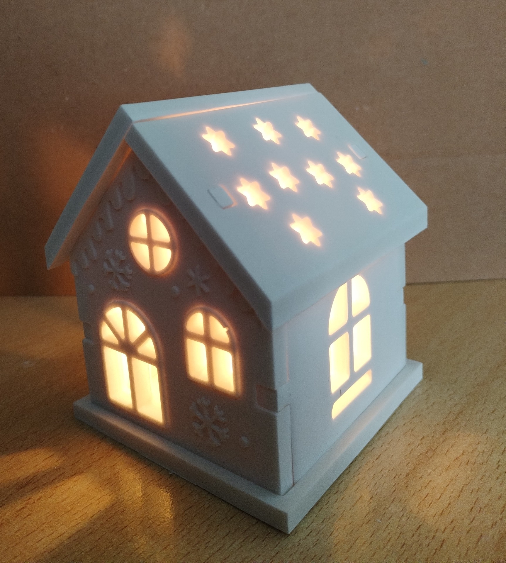 Ručně vyráběný svícen ve tvaru domku z umělého kamene.