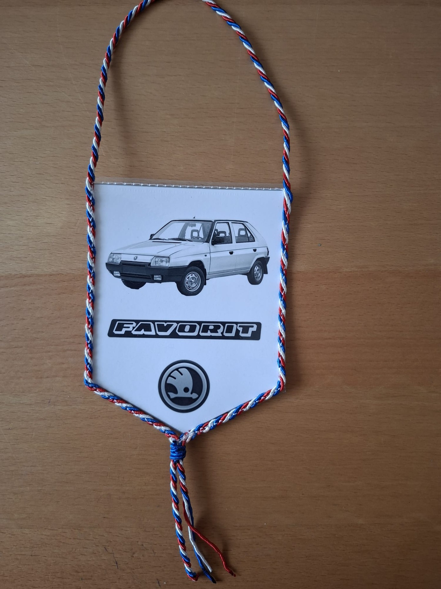 Design a materiály: Vlaječka má klasický trojúhelníkový tvar a je vyrobena z pevného materiálu. Celý obvod a závěsná šňůrka jsou tvořeny splétanými textilními provázky v barvách české trikolory (červená, bílá, modrá), což dodává produktu osobitý vzhled.