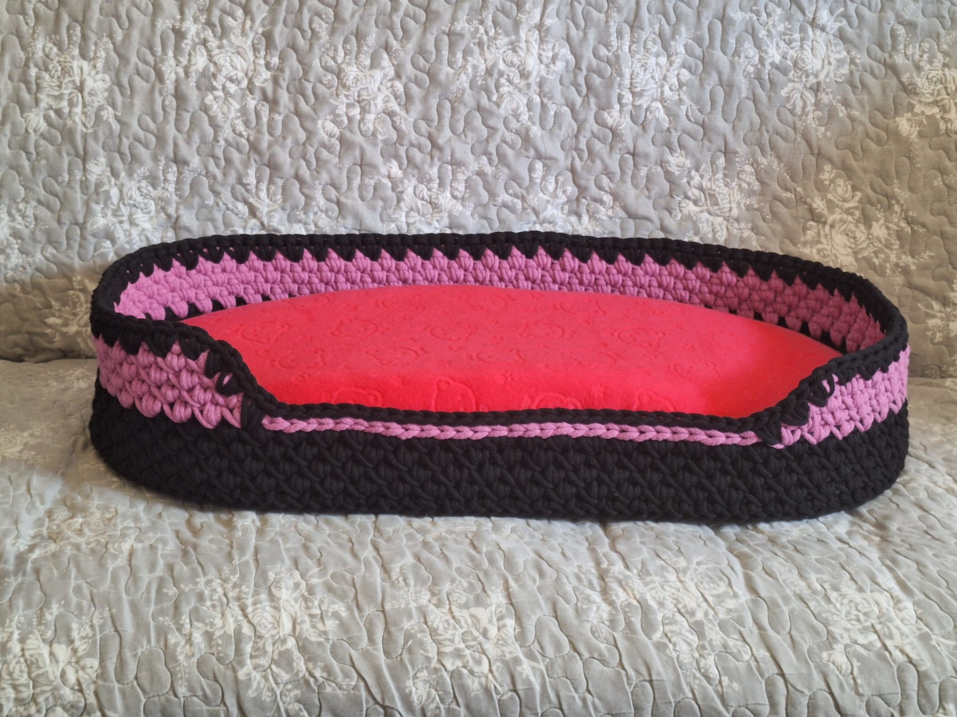 Ručně háčkovaný oválný pelíšek – Černo-červený