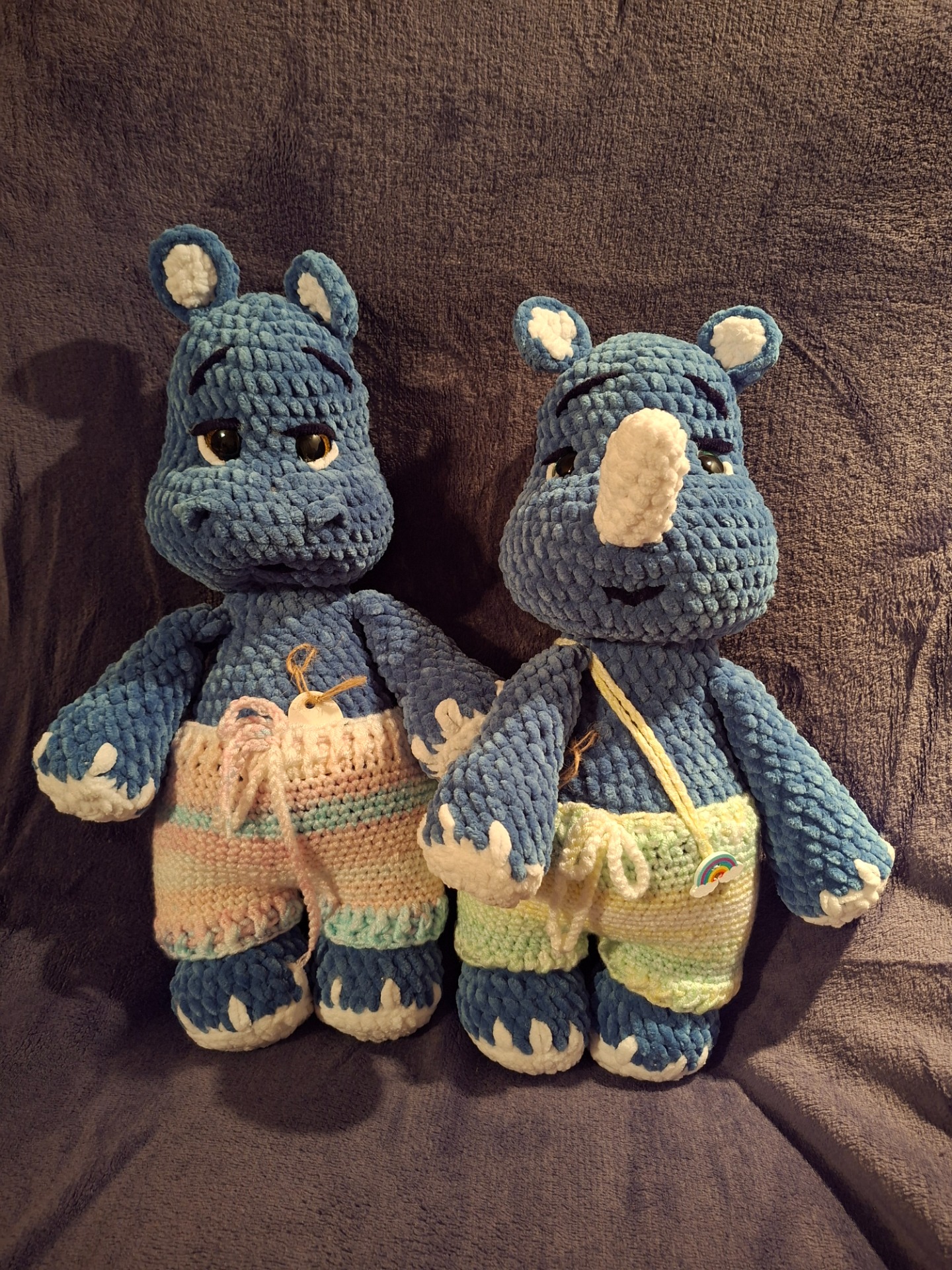 Ručně háčkovaný hroch a nosorožec.
