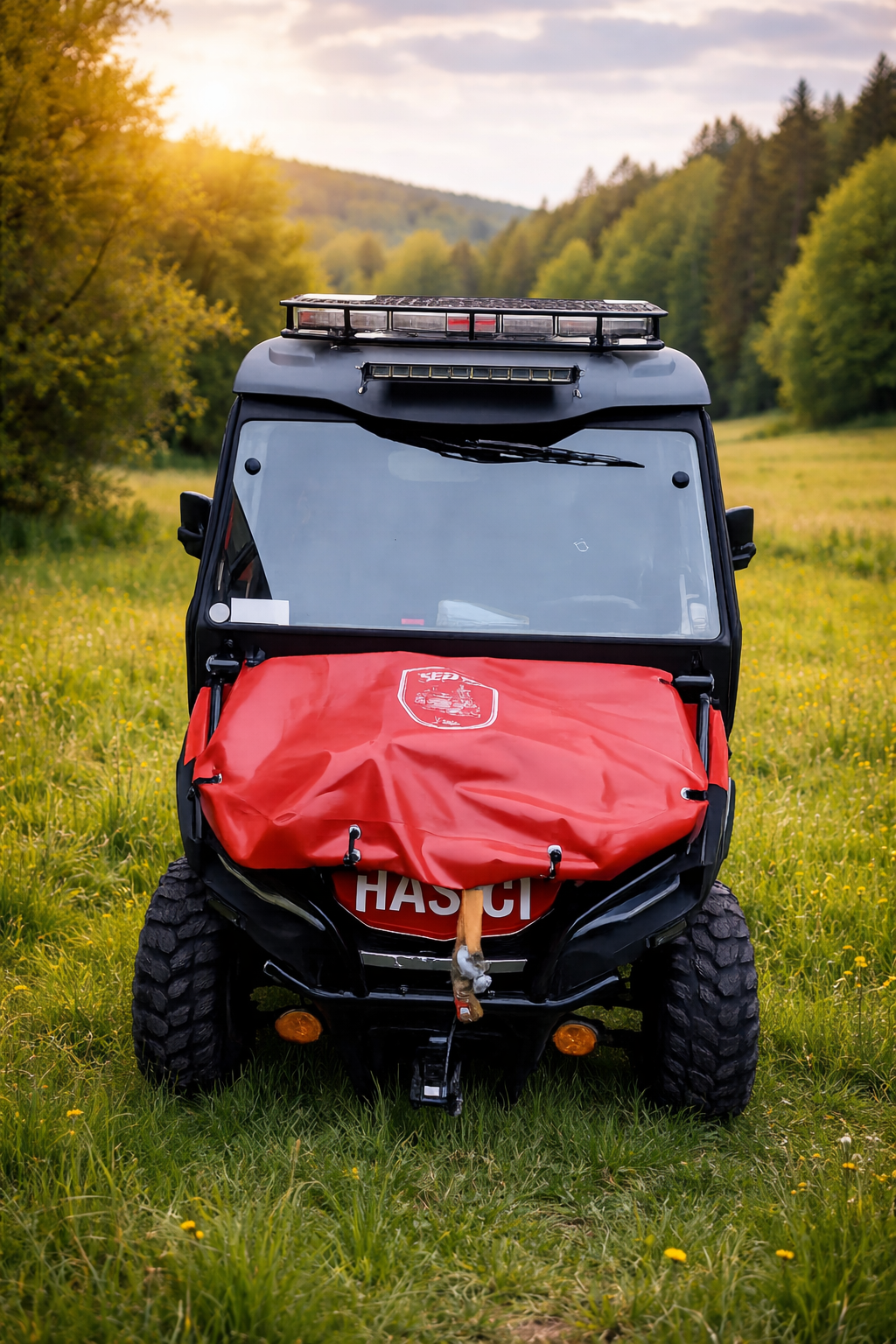 Na míru šitá krycí plachta na čelo čtyřkolky včetně potisků.