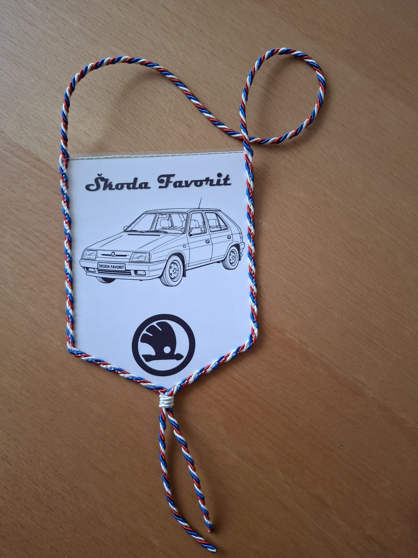 Design a materiály: Vlaječka má klasický trojúhelníkový tvar a je vyrobena z pevného materiálu. Celý obvod a závěsná šňůrka jsou tvořeny splétanými textilními provázky v barvách české trikolory (červená, bílá, modrá), což dodává produktu osobitý vzhled.